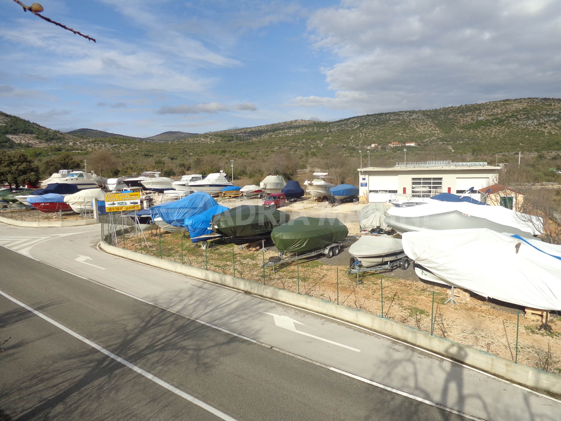 Dry dock is situated in the Splitsko-dalmatinskoj district at the Adriatic higway D8 at Marina county in place called Svinca, precisely half way between two marinas on sea: marina Agana and marina Frapa in Rogoznica, remoted 5 kilometer from sea.